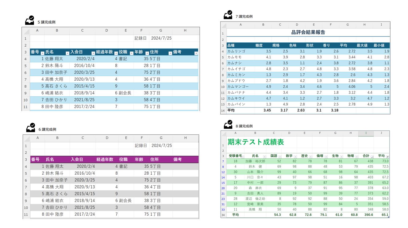 章末では「期末テスト成績表」の作成を通して、データの整理・抽出・集計を一連の流れで実践します。実務でもすぐに活用できる内容です。