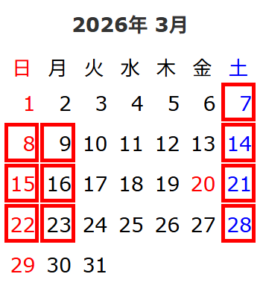 試験実施日は、カレンダー内で【赤枠】表示されている日程です。