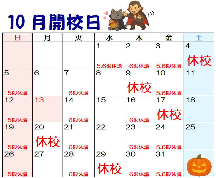 10月は特別なお休みはございません。平常どおり、曜日ごとの営業時間に沿って開校しております。