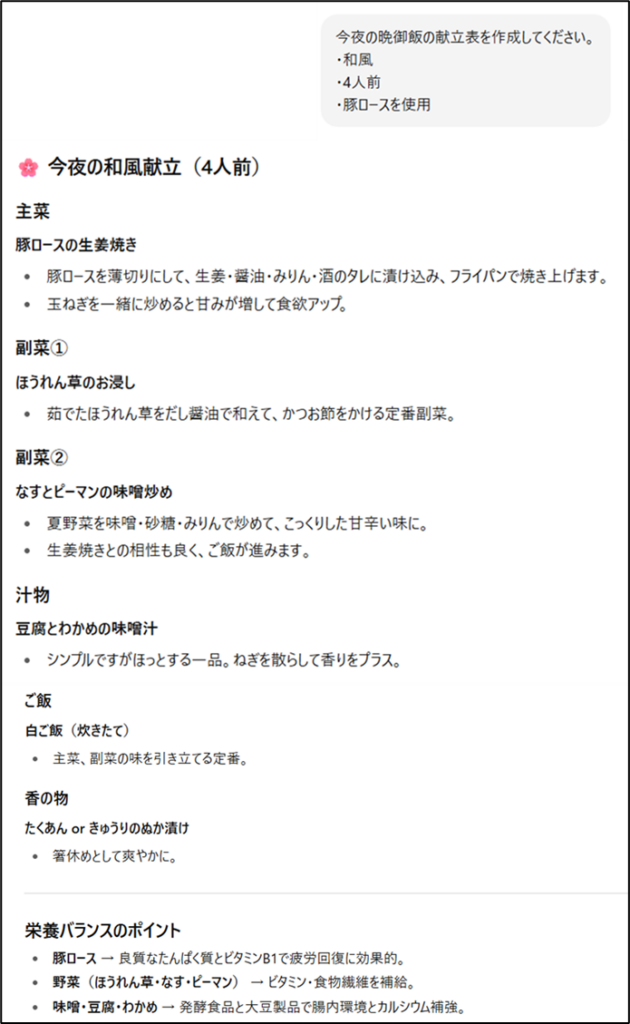 そのような時に、ChatGPTにオススメの献立を聞いてみましょう。