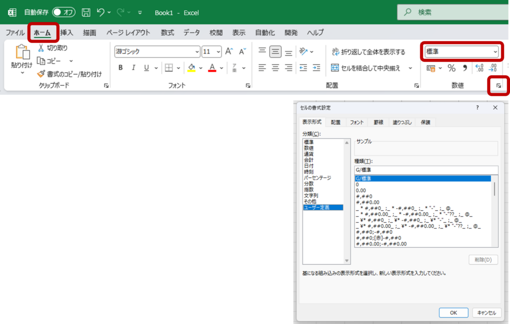 表示形式を変更する場合、[ホーム]タブ[数値]グループに表示されている「数値の書式」を利用することで、簡単に表示形式を変更することができます。直観的で分かりやすいので、こちらを利用している、という方も多いかもしれませんね。