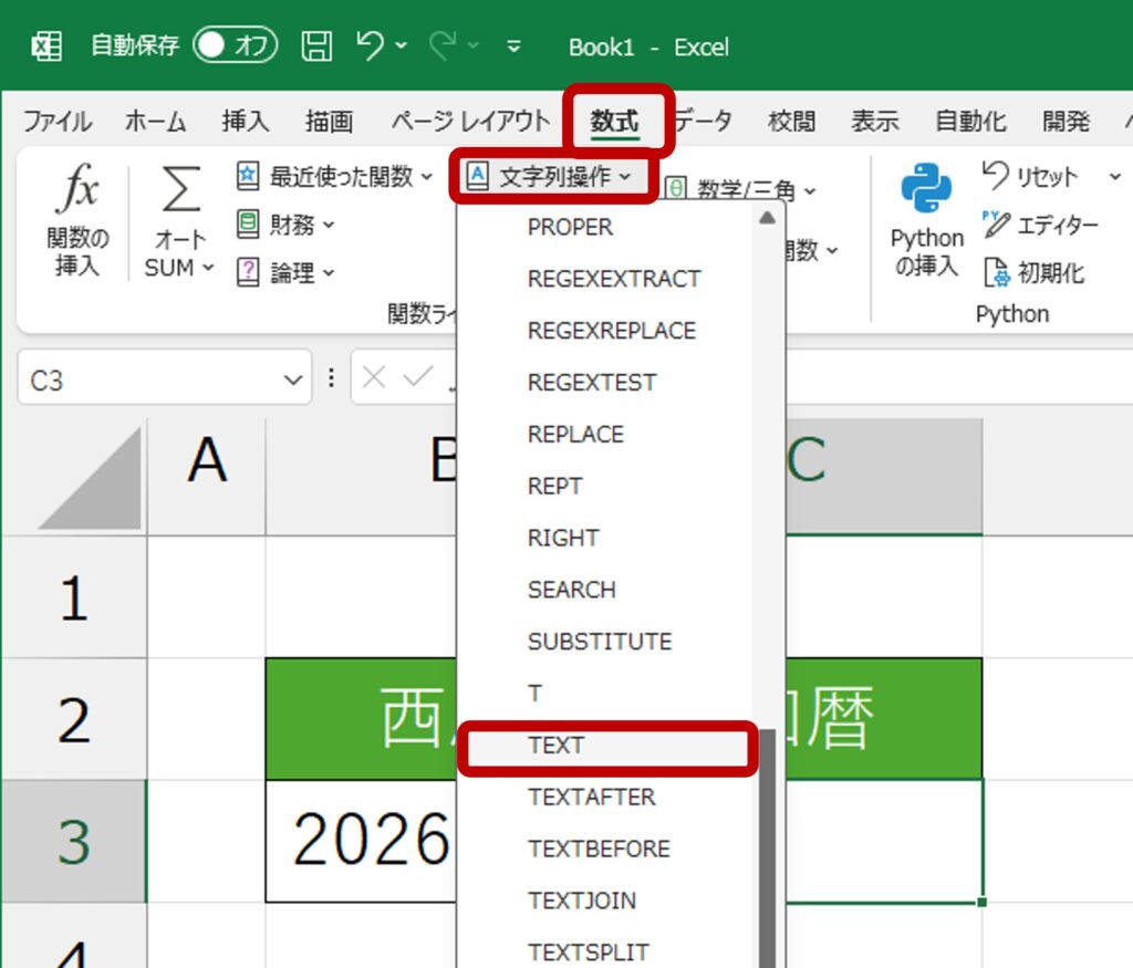 画面上部に表示されている[数式]タブをクリックし、切り替わったリボンの中から、[関数ライブラリ]グループに表示されている「文字列操作」ボタンをクリックします。関数名の一覧から、「TEXT」を探し、クリックしましょう。