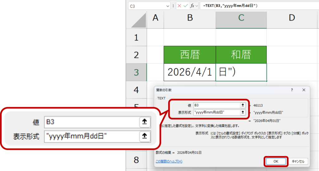 関数ダイアログボックスが表示されたら、項目に従い、入力を行います。全ての項目が入力出来たら、OKボタンをクリックしましょう。