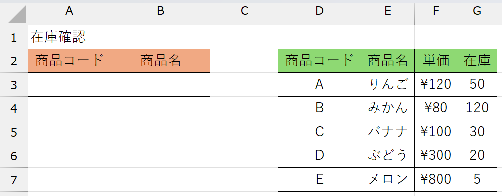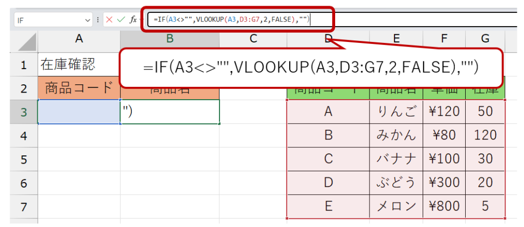 セルA3に商品コードを入力すると、商品名が表示されます。