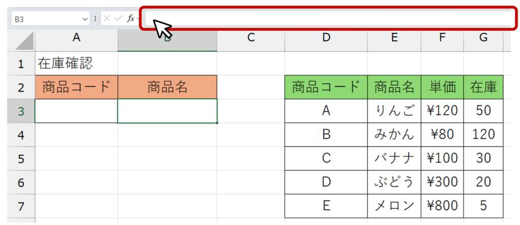 セルB3をクリックすることができたら、画面上部に表示されている、数式バーにマウスを移動させ、クリックしましょう。クリックすると、数式バーに文字が入力できるようになります。